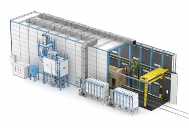 Комплектация включает четыре лифт-площадки для операторов и вакуумную систему сбора и рекуперации абразива с производительностью до 10 000 кг/ч, объемом воздуха около 3930 м³/ч, давлением вакуума — 450 мм рт.ст., электродвигателем мощностью 75 кВт IP55. Вакуумная система включает циклонные и картриджные фильтры с импульсной системой продувки, силос объемом 8 000 кг (габариты: 2100х1900х2700 мм; вес — около 1500 кг), а также силос для дроби и систему рекуперации дроби на базе ленточных элеваторов.